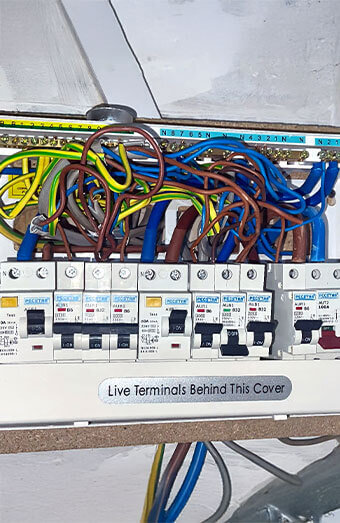 Complete rewiring of internal switchboard connections to eliminate unsafe or deteriorated cabling, ensuring consistent power flow and system reliability.